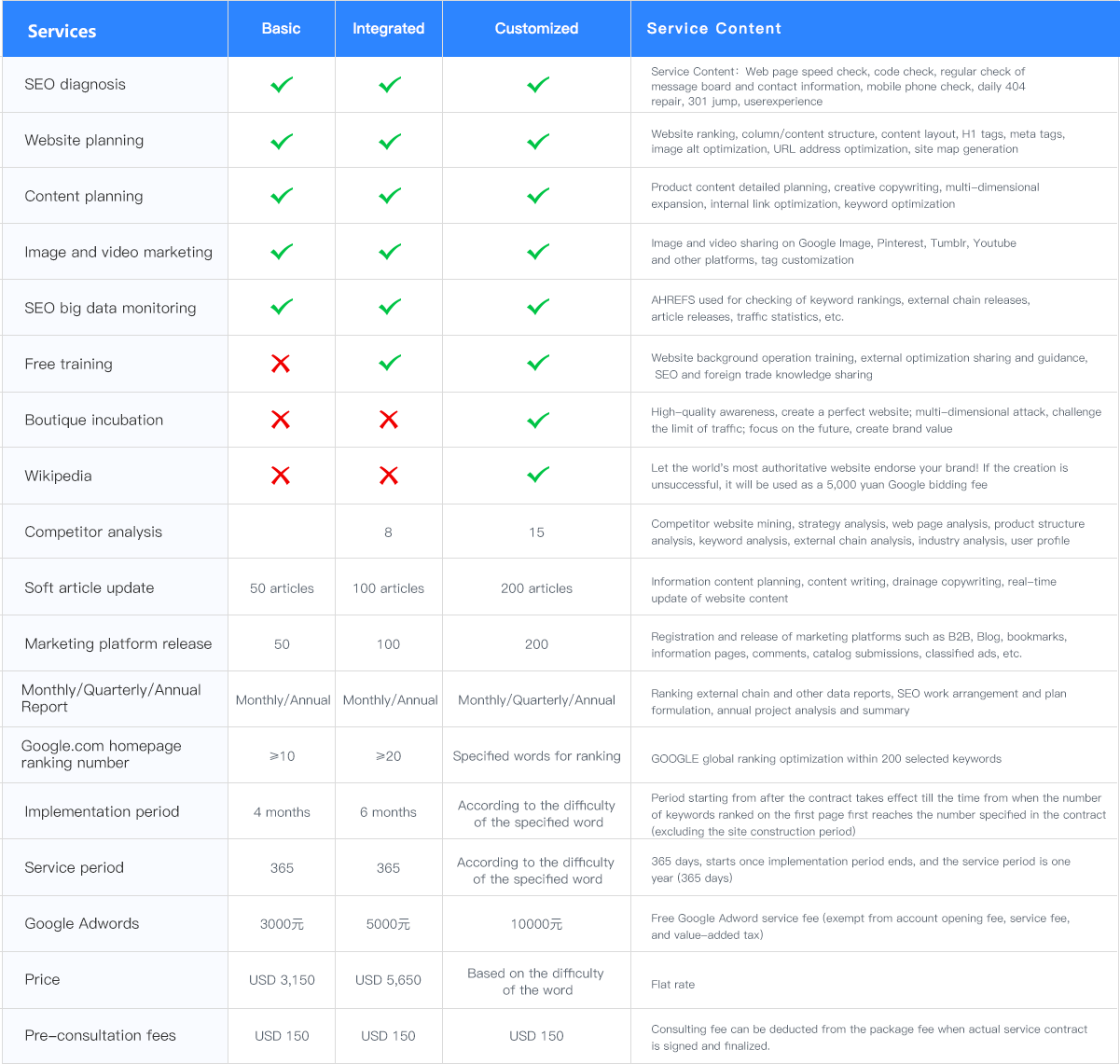 | Monthly/Quarterly/Annual Report | Monthly/Annual | Monthly/Annual | Monthly/Quarterly/Annual | Ranking external chain and other data reports, SEO work arrangement and plan formulation, annual project analysis and summary |